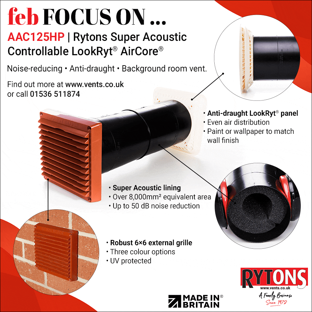 This month, we are highlighting the Rytons AAC125HP | Super Acoustic Controllable LookRyt® AirCore® – a simple and effective background room ventilator that provides fresh air into habitable rooms to satisfy the requirements of Approved Document F. Designed to disperse moisture, odours and airborne pollutants, it supports healthy indoor air quality without mechanical components or running costs.