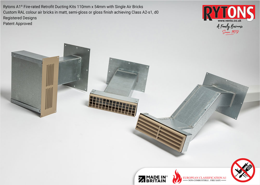 - Rytons A1® Fire-rated Retrofit Ducting Kits 110mm x 54mm with Single Air Bricks are made from galvanised steel. Galvanised steel is considered fire class A1 without testing, as per European Commission paper 96/603/EC referred to in BS EN 13501-1:2018.