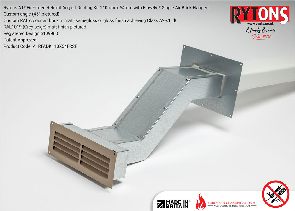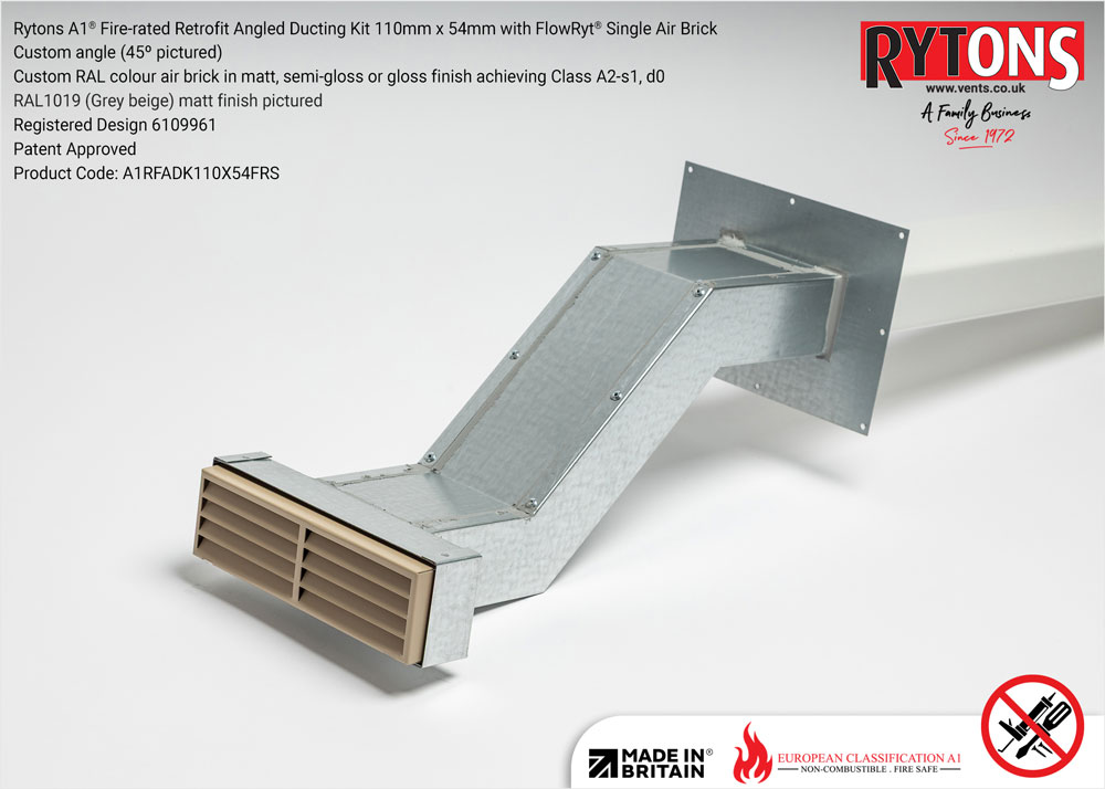 Rytons A1® Fire-rated Retrofit Angled Ducting Kit 110mm x 54mm with FlowRyt® Single Air Brick