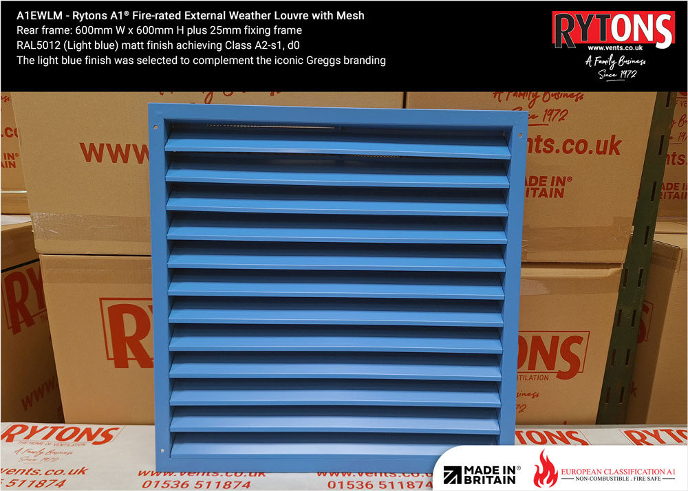 A1EWLM: Rytons A1® Fire-rated External Weather Louvre with Mesh - RAL5012 (Light blue) for Greggs